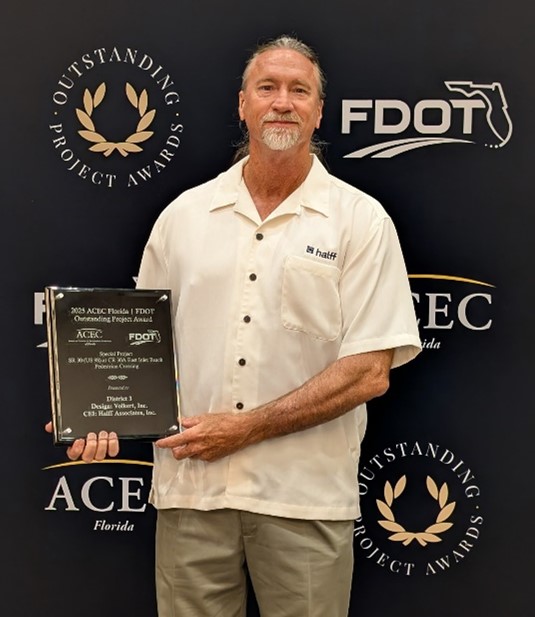 Halff Project Administrator Doug Pritchard was on site to receive the award at the June 6 Conference in Orlando, Florida, on behalf of Halff’s Crestview CEI team, which includes Trae Hurst, Robbin Moody, Michael Graham and Christian Ashton.